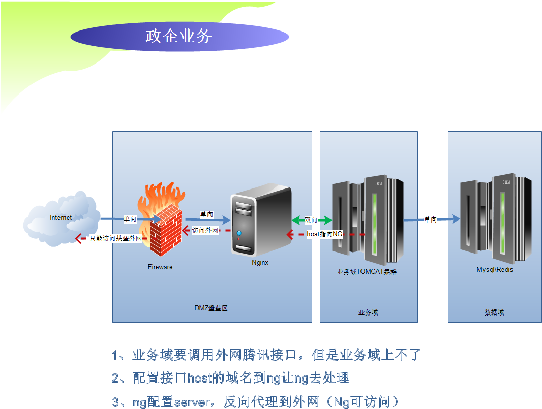 在政企用户中,服务器各域的调用层层严格,各个域中调用的防火墙规则把控复杂.一般分为DMZ(堡垒区),业务区,数据区.中间的层级调用一般规则为,要开什么端口,数据是单向还是双向.一般只允许DMZ访问外网,业务域不允许,但是开发公众号,或支付业务等要访问外网的时候,业务域没法访问,那就麻烦了.
